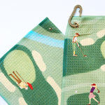 Designed with Claire Nilan, this scene-stealing piece captures the quirks and charm of a day on the course, rolling greens, tiny players, and all the action in between. Printed on ultra-absorbent waffle weave and easy to clip on, it’s a functional essential with a playful twist.