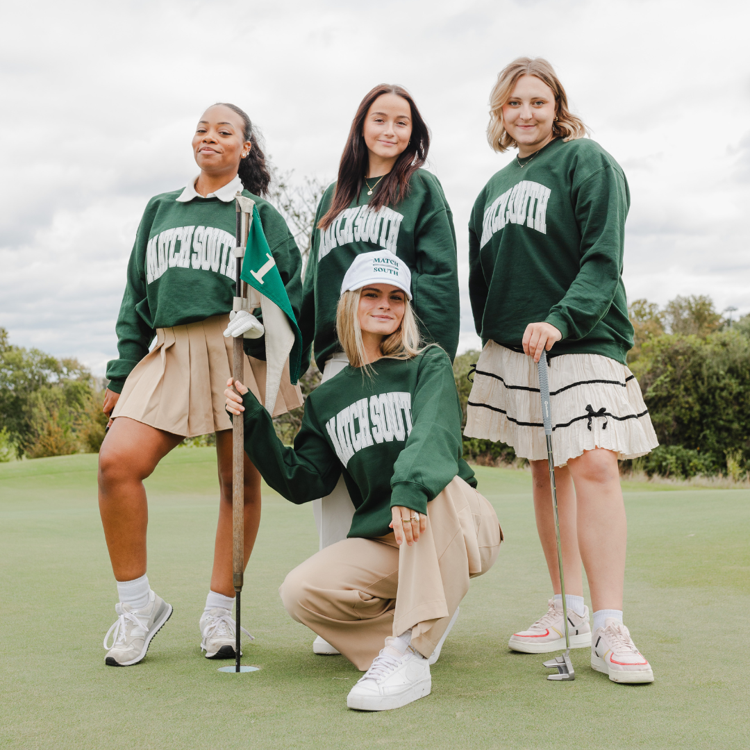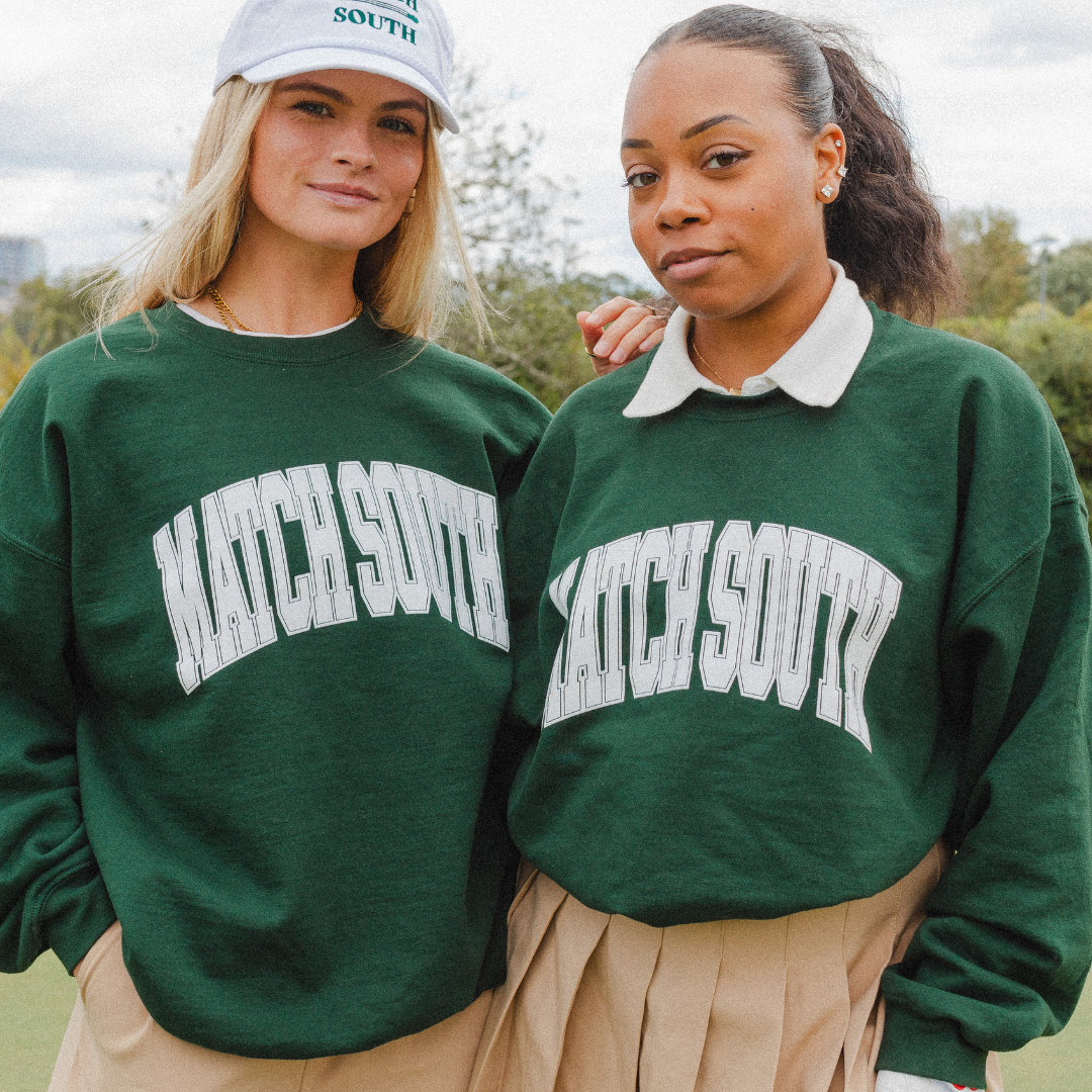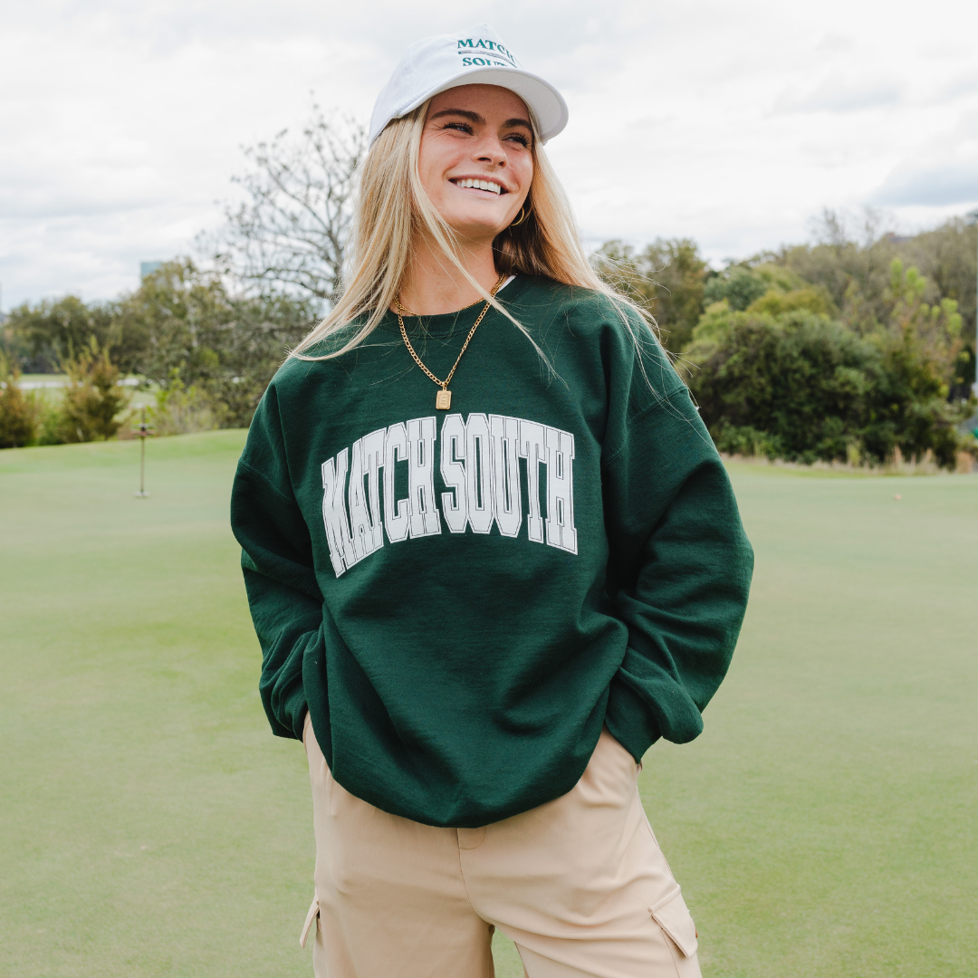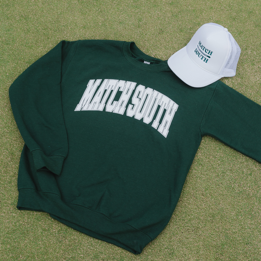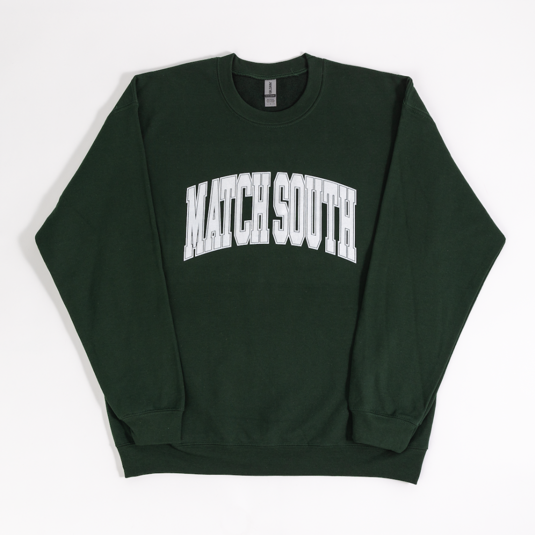 Elevate your casual wardrobe with the dark green Match South Crewneck, a varsity-style classic. This crewneck offers timeless style and exceptional comfort for any occasion.